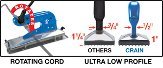 The ultra-low profile and narrow handle of this iron make it easier to bring the seam together near the back of the iron. Dual indicator lights show both power-on and heating status. Cord life is improved with the rotating cord assembly with flexible strain relief which extends the cord out of the seam area. The heavy-duty handle and riveted tray are highly durable. The back tip of the base is grooved to comb adhesive to the wall as the iron is angled out. This prevents “dragging-off” of adhesive which can cause failure. Non-stick coated base and 12′ long HSJO cord are standard. Approximate heat range is 220° – 425°F. Runs at 800 watts. Net weight: 3 1/3lbs.