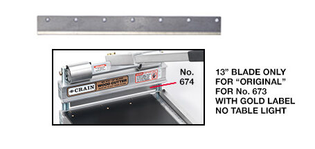 Includes one 13″ blade for the original Crain No. 673 13″ Wood Cutter, which took a 13″ long blade. This model cutter had a gold-colored label on the blade carrier, and did not include a table light mounted on the blade carrier. This blade is made from high carbon steel, and is heat-treated and ground for sharpness. Net weight: 6 oz.