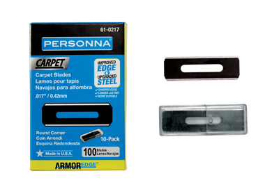 Includes a pack of 100 Personna® heavy-duty (.017 thick) round edge slotted razor blades. The individual blades come in 10 pack plastic safety vials for sharing. Round edge blades are preferred by many carpet installers because the round corner rides on the subfloor without digging in and creating extra resistance. These blades can be used in the following Crain tools: Nos. 217, 247, 290, 300, 304, 301, 302, 303, 330, 720, 735, 725, 726. Blade dimensions: length: 2.25″, width: .75″, thickness: .017″. Pack weight: 12 oz.